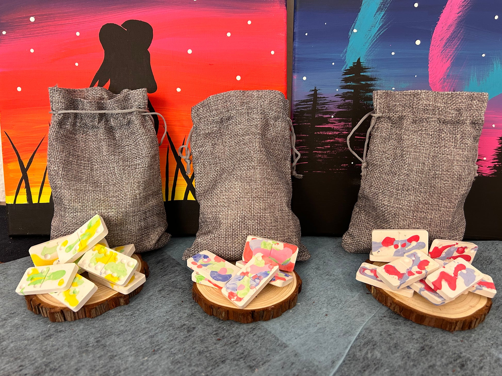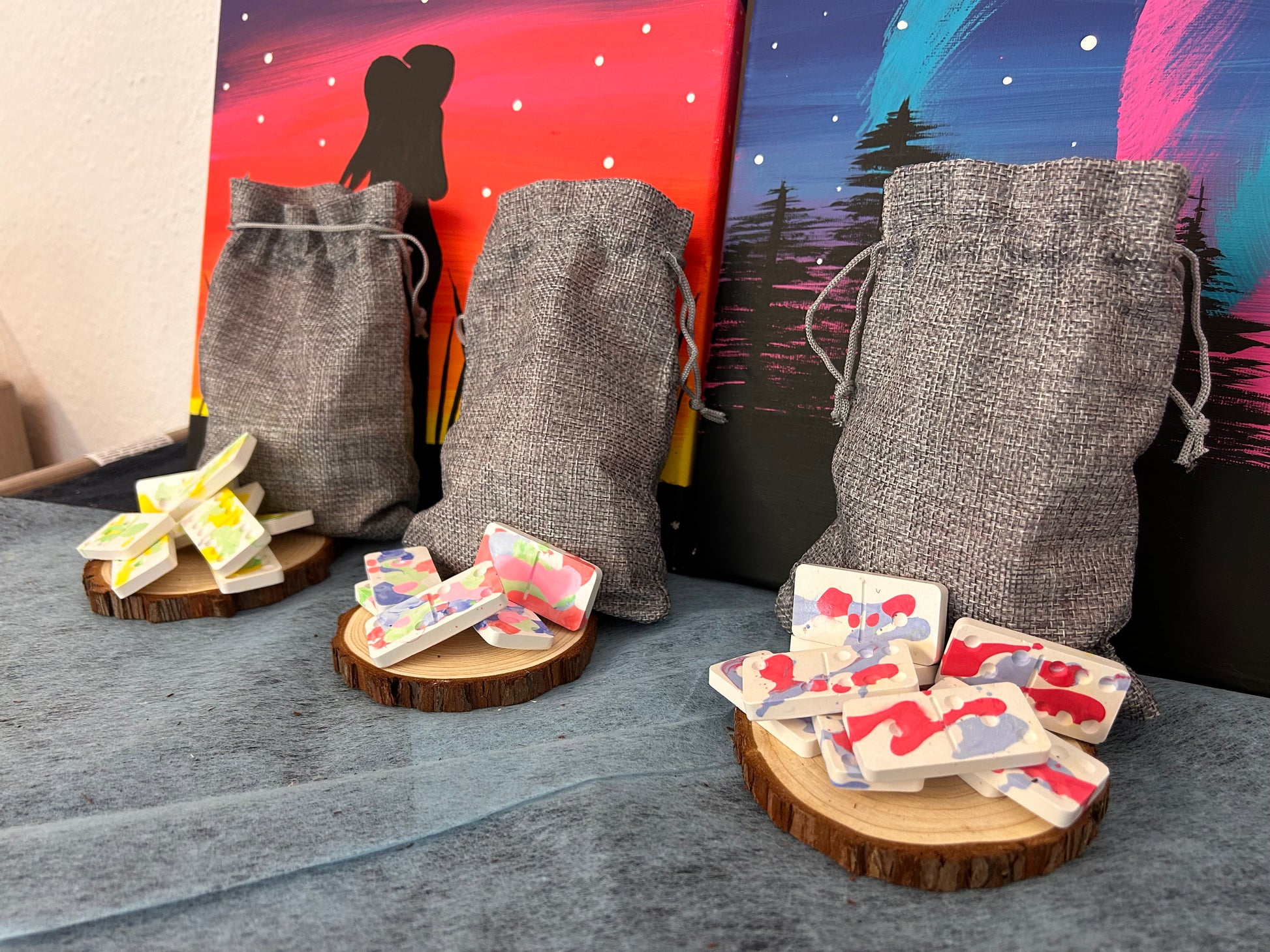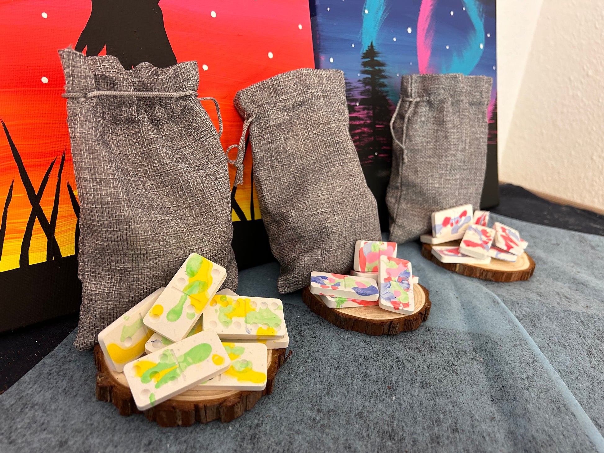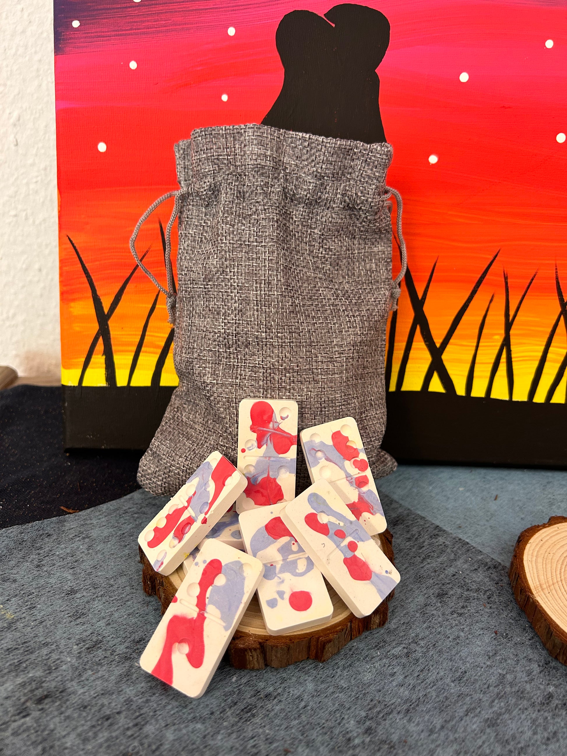 Dieses handgefertigte Domino-Spiel besteht aus hochwertigem Reliefgießpulver und Keraflott und zeichnet sich durch seine einzigartigen Farben und Strukturen aus. Jeder Dominostein wurde sorgfältig in leuchtenden und abwechslungsreichen Farbtönen gestaltet, was das Spiel zu einem optischen Highlight macht. Die Steine haben eine handliche Größe von 3 cm Länge, 2 cm Breite und etwa 1 cm Höhe – ideal für komfortables Spielen und stilvolle Präsentation.